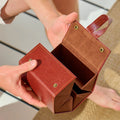 Designed for both style and functionality, it features a sophisticated faux brown leather exterior, a soft suede-like interior to prevent scratches, and a clever folding pentagon design that clips securely shut. When unfolded, a large loop allows for convenient hanging—ideal for hotel rooms, closets, or on-the-go access.