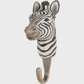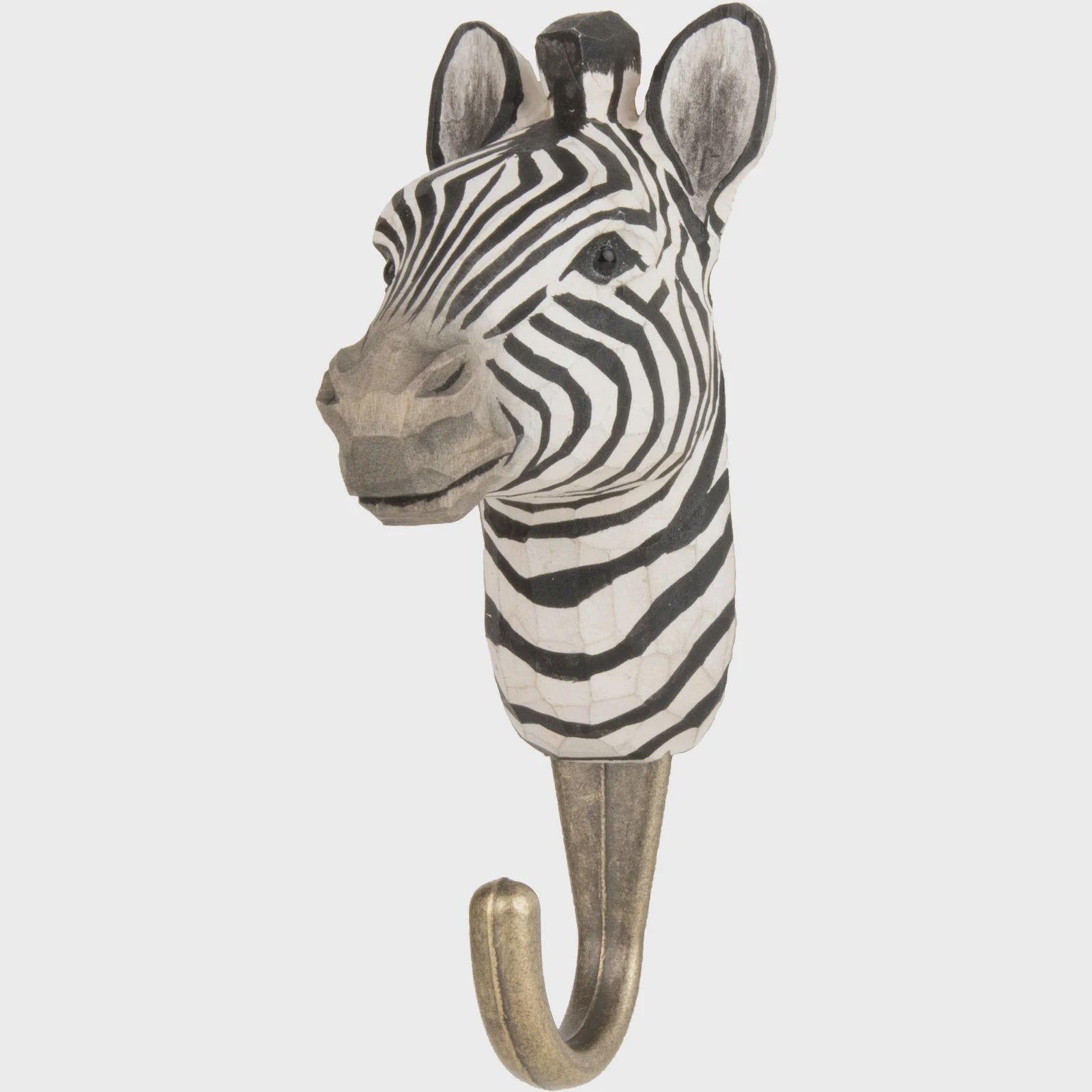 Each Wildlife Garden DecoHook features a durable metal hook topped with a hand-carved and brush-painted linden wood zebra head. Individually crafted, each piece is unique, offering a striking and practical accent for any interior.