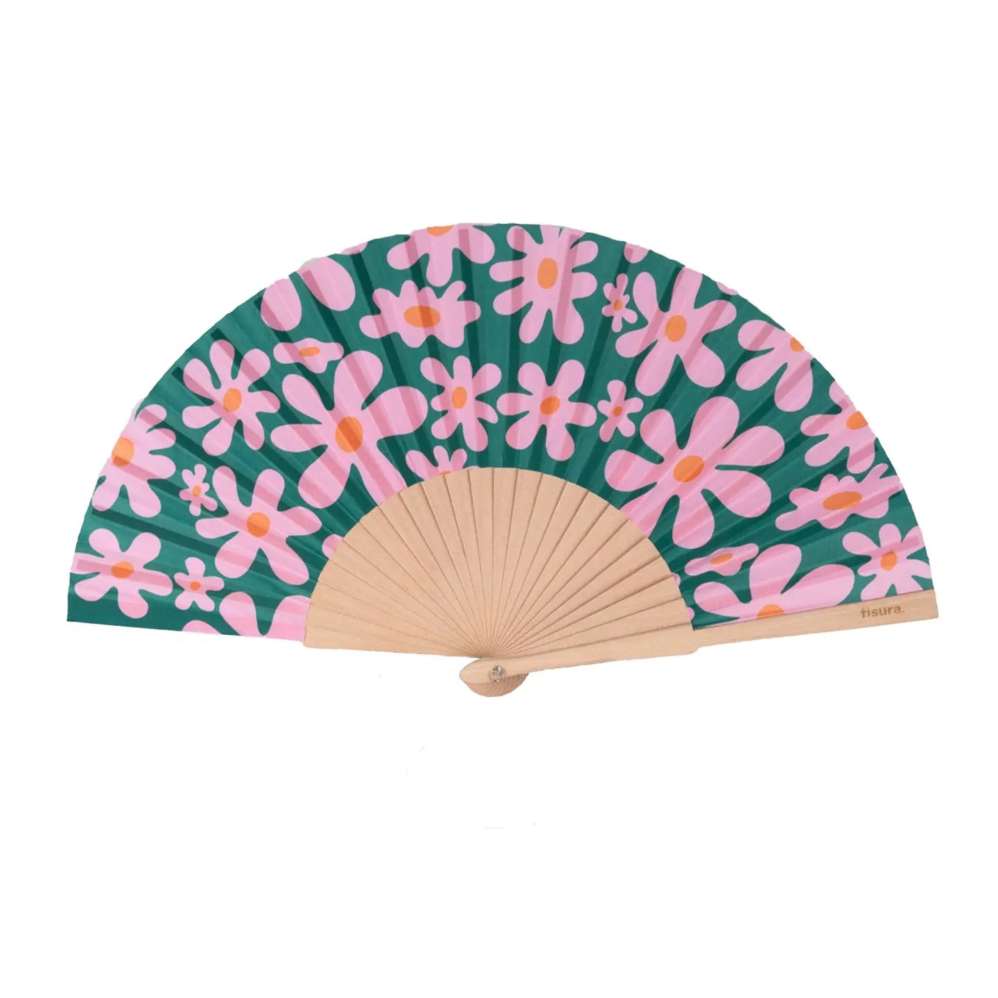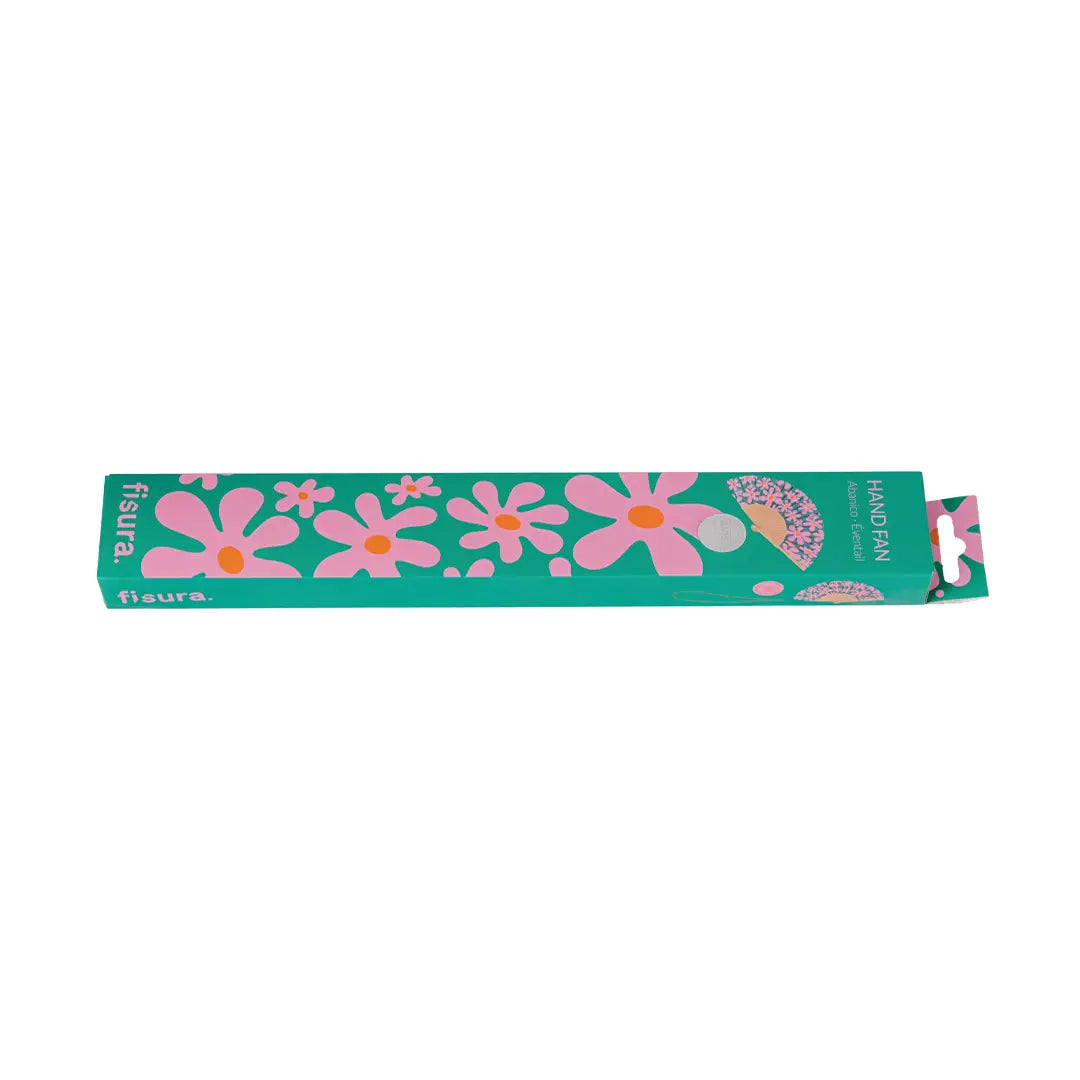 Add a splash of retro charm to your look with this original Fisura hand fan, featuring a vibrant flower print inspired by vintage designs. The playful pink and green colour combination brings a fresh, modern twist to a classic accessory.